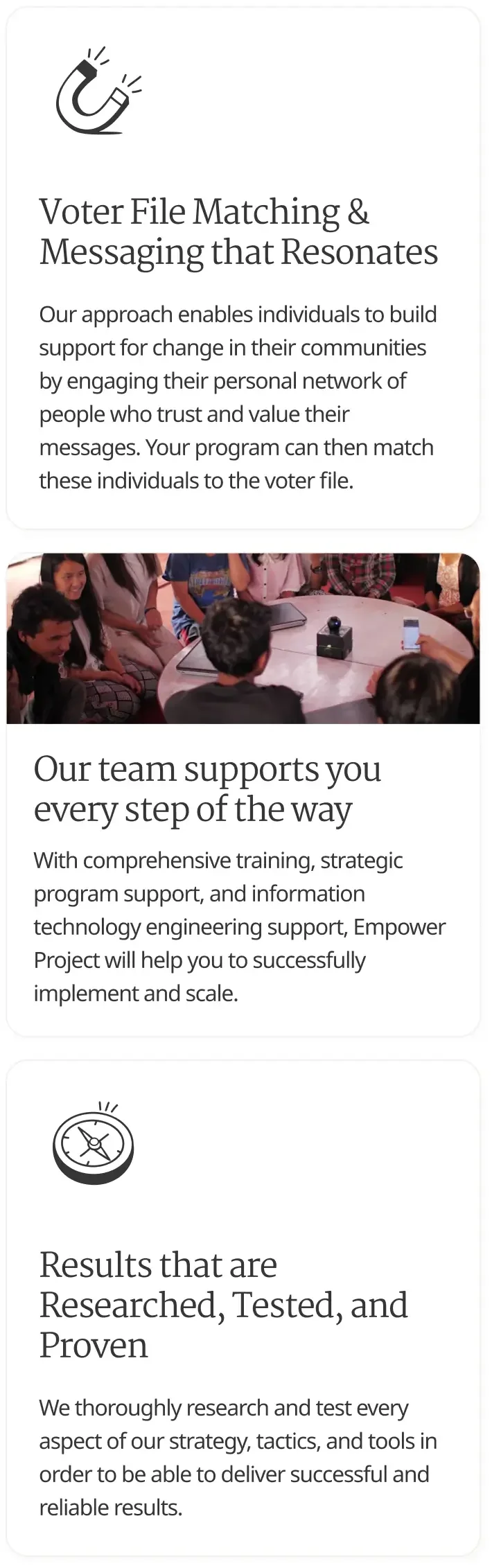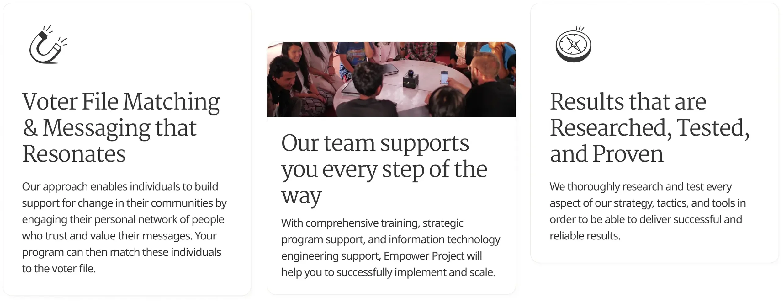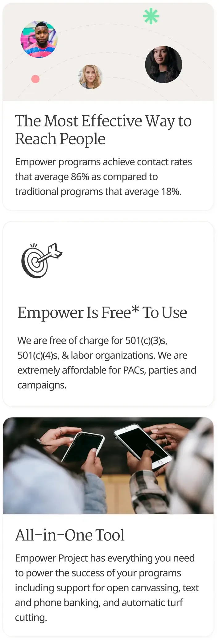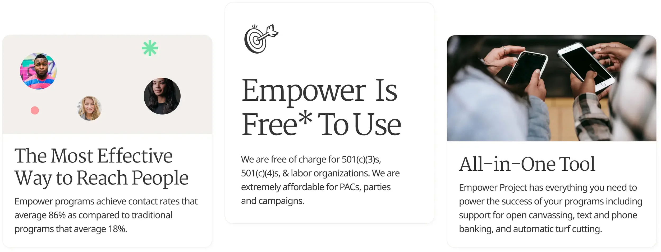 Approved 501(c)(3)s, 501(c)(4)s, and labor organizations enjoy FREE access to a suite of organizing tools, including both the organizer and activist smartphone apps. Empower is affordable for state parties and candidates. Available in English and Spanish, web and mobile.